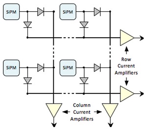 Мультиплексирование выходного сигнала осуществляется в два этапа. Во-первых, симметричная схема деления заряда разделяет 144 канала массива 12х12 матрицы SiФЭУ ArraySL-4p9 на 12 строк и 12 столбцов. Эти сигналы сводятся к четырем каналам путем применения взвешенного усиления для каждой строки и каждого столбца пропорционально его положению вдоль каждой оси. Такое кодирование амплитуды создает 2 сигнала (Х+, Х-), представляющих столбец местоположения события и 2 сигнала (Y+, Y-), представляющих строку местоположения события. Новая методика деления заряда, разработанная компании AiT Instruments, использует активные диоды вместо резисторов для обработки сигналов SiФЭУ до усиления. В частности, диод помещается между фотодетектором и быстрым трансимпедансным усилителем. Когда сигнал на фотодетекторе имеет положительную полярность, то низкое прямое сопротивление диода позволяет току течь от фотодетектора до усилителя, в тоже время высокое обратное сопротивление диода не дает току протекать от усилителя до фотодетектора. На рисунке 4 показана схема считывающей электроники. Диоды сокращают нежелательные токи утечки SiФЭУ. Снижение токов утечки улучшает пространственную однородность и позиционирование события.