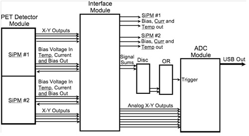 Выводы схемы платы считывания соединены с интерфейсным модулем (модель SiPMIM4х4, AiT Instruments), который может считывать сигналы максимум с четырех матриц SiФЭУ ArraySL-4p9 (эквивалентно двум или четырем модулям). Модуль выводит индивидуальные аналоговые сигналы со считывающей электроники на разъем с 34 контактами, расположенный на передней панели устройства. В дополнение модуль суммирует выходные сигналы с каждой матрицы SiФЭУ ArraySL-4p9. Эти сигналы используются для запуска аналого-цифрового преобразования Х-Y выходов. Кроме того, интерфейсный модуль подает питание и напряжение смещение на считывающую электронику. Наконец, существует возможность отслеживания напряжения смещения, тока, а также температуры на каждом SiФЭУ (за счет датчиков температуры, расположенных на плате) с помощью вывода с 24 контактами на интерфейсном модуле.