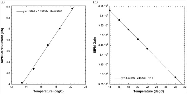 График показанный на рисунке 6(а) демонстрирует уменьшение темнового тока при снижении температуры. Как можно видеть на графике, проведя аппроксимирующую прямую, зависимость темнового тока от температуры линейная в этом температурном диапазоне. На рисунке 6(б) показан график зависимости коэффициента усиления от температуры матрицы SiФЭУ ArraySL-4, рассчитанного из данных SensL.
