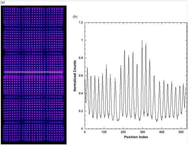 Возможно, лучший способ выяснить насколько увеличенный сигнал и пониженный уровень шума влияет на производительность детектора это оценить точность, с которой события локализуются в массиве сцинтиллятора. Чтобы охарактеризовать эту величину мы вычислили средний коэффициент контрастности максимального и минимального значения сцинтилляционной вспышки для модуля. Результаты показанные на рисунке 8(а) демонстрируют, что значение этого коэффициента вырастает примерно на 45% при понижении температуры с 28° С до 16 °С. Как было описано выше охлаждение детектора увеличивает коэффициент усиления и сокращает значение темнового тока, тем самым амплитуда сигнала повышается, а уровень шума снижается. Так как эти сигналы используются для вычисления местоположения события в массиве сцинтиллятора с алгоритмом центром масс, более высокие амплитудные сигналы при низких шумах делают эти расчеты точнее. Хотя увеличение коэффициента контрастности максимального и минимального значения сцинтилляционной вспышки должно привести к улучшению пространственного разрешения, но все же это не является прямым показателем данного параметра. В конечном счете, улучшение пространственного разрешения в результате охлаждения SiФЭУ может быть оценено только после того как будет получен опытный образец сканера.