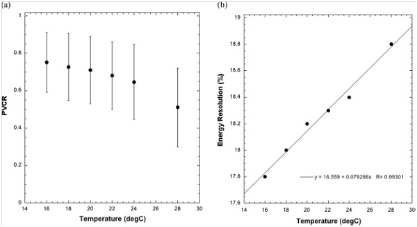Рис. 8 (а) Средняя зависимость степени контрастности максимального и минимального значения сцинтилляционной вспышки от температуры (планки погрешностей показывают стандартное отклонение от среднего значения коэффициента контрастности (б) зависимость энергетического разрешения от температуры.