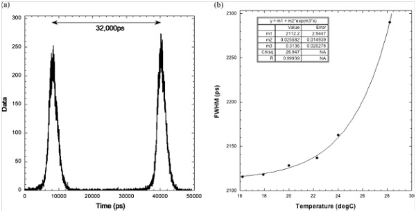 Рис.9 (а) Рассчитанные кривые временного разрешения схемы совпадений и (б) зависимость временного разрешения схемы совпадений от температуры.