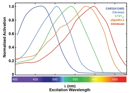 Важно отметить, что в последние годы была разработана обширная флора опсинов для оптогенетики. Когда появилась необходимость одновременной манипуляции поведением исследуемого организма, были разработаны опсины, например, чтобы проводить сменные активации и замедления популяции нейронов [6] или для параллельной активации двух различных популяций нейронов в пределах одной области головного мозга [7]. Оба варианта достигаются благодаря использованию света разных длин волн. Решающим значением в этих примерах является то, что с помощью различных длин волн света можно избирательно активировать один опсин, оставляя другие опсины неизменными. Если два опсина должны быть ориентированы на одну область головного мозга, спектральное перекрывание и относительные усиления генерируемых фототоков, должны быть приняты во внимание при выборе длин волн стимуляции и интенсивности излучения.