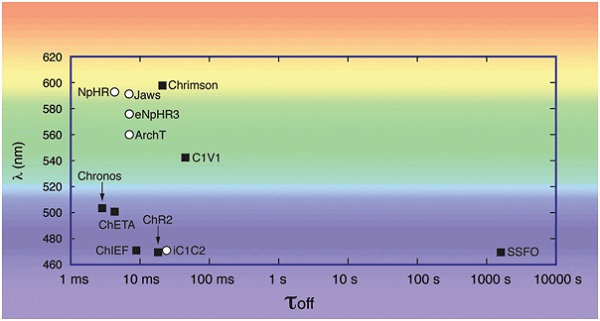Последние достижения в оптогенетике включают в себя разработку опсинов, которые активируются при одной длине волны света и замедляются разными длинами волн – так называемые ступенчатые опсины [5]. Одиночный импульс света одной длины волны активизирует опсин и вызывает постепенное изменение ионных потоков в мембране нейрона, которые могут быть остановлены световым импульсом с другой длиной волны. Чаще всего синий свет используется для активации, а красный свет для замедления, но и другие комбинации длин волн также были использованы. Уже давно инженеры исследуют активацию опсинов чувствительных к красному свету [8].