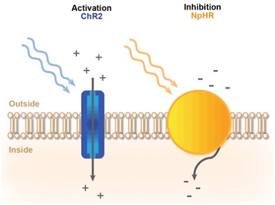 Рис. 3. Принцип светоопосредованного контроля нейронной активности. Обычно используется активация опсина-каналродопсина2 (ChR2), позволяющая вводить положительно заряженные ионы при освещении синим светом. В результате мембрана нейрона деполяризуется и генерируются потенциалы возбуждения. Замедляющий опсин - галорходопсин (NpHR) возбуждает отрицательно заряженные ионы при освещении жёлтым светом. В результате мембрана нейрона гиперполяризуется и потенциал возбуждения тормозится.