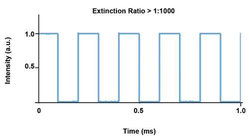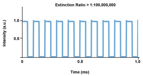 DPSS лазеры могут работать в широком динамическом диапазоне мощности, но имеют ограничения по возможности модуляции. Тем не менее модулированные DPSS лазеры, как правило, не имеют достаточно хорошей согласованности от импульса к импульсу и стабильности питания во время модуляции для удовлетворения требований задач оптогенетики. Поэтому для использования в оптогенетике DPSS лазерам нужен встроенный модулятор или быстрый затвор для модуляции света, что позволяет устройствам работать непрерывно и, следовательно, с как можно более высокой стабильностью (Рис. 7).