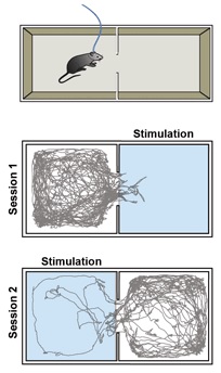 Рисунок 8 показывает, что применение света приводит к непосредственному выражению аверсивного поведения, т.е. мышь полностью избегает камеру, где активируется лазер. Для подтверждения факта, что аверсивное поведение вызвано именно активацией нейронов, а не внешними факторами лазер впоследствии срабатывает в другой камере. В результате, мышь теперь избегает этой камеры.