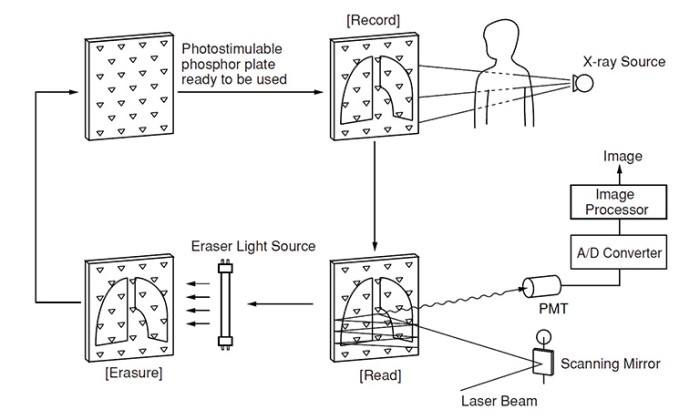 При облучении пластины рентгеновским излучением в ней накапливаются электроны. Затем лазерный луч сканирует (возбуждает) изображение, сформированное на люминофорной пластине, вызывая излучение видимого света в соответствии с количеством накопленных рентгеновских лучей. Фотоэлектронный умножитель преобразует этот слабый видимый свет в электрические сигналы, которые затем обрабатываются в цифровом виде для восстановления изображения.