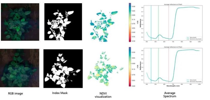 Гиперспектральные камеры Specim FX10 и FX17 играют ключевую роль в этом процессе. Благодаря возможности сбора гиперспектральных данных высокого разрешения, они позволяют исследователям отслеживать различные вегетационные индексы, включая нормализованный разностный вегетационный индекс (NDVI), индекс фотохимического отражения (PRI) и индекс хлорофилла. Эти индексы дают ключевую информацию о здоровье растений, скорости роста и состоянии воды. Кроме того, рассчитывая такие параметры, как содержание хлорофилла и азота в растительном покрове, платформа PhenoTrait может предложить высокоточные оценки, которые необходимы для оптимизации ухода за растениями.