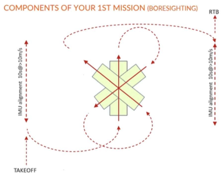 Рисунок 11 иллюстрирует этапы бортировочной миссии. После взлета и достижения заданной высоты необходимо выполнить выравнивание инерциального измерительного модуля (IMU). Это можно сделать в ручном или автоматическом режиме. Выравнивание выполняется путем резкого ускорения до скорости менее 10 м/с в выбранном направлении на протяжении менее 10 секунд, затем резкого торможения и продолжения движения в обратном направлении с той же скоростью и на протяжении того же времени.