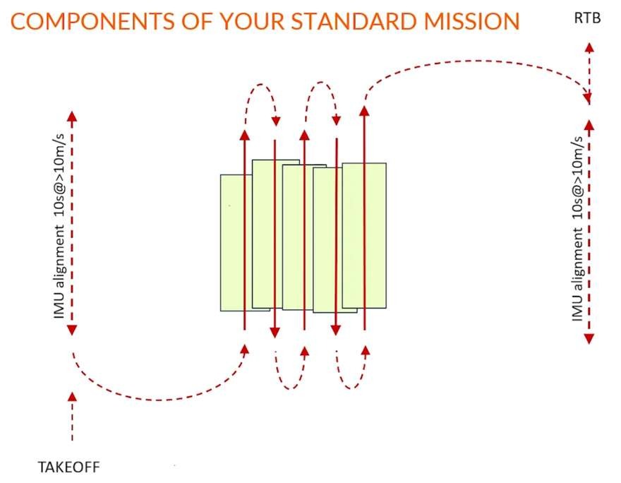 Составные элементы стандартной (не-бортировочной) миссии, например, при съемке территории или проведении коридорной съемки, аналогичны (см. рисунок 12). После взлета начинается этап выравнивания инерциального измерительного блока (IMU), после чего выполняется автоматический пролет по запланированным маршрутным линиям. При наличии системы постобработки с кинематикой (PPK), дополнительный прогон выравнивания IMU выполняется в конце миссии перед возвращением на базу.
