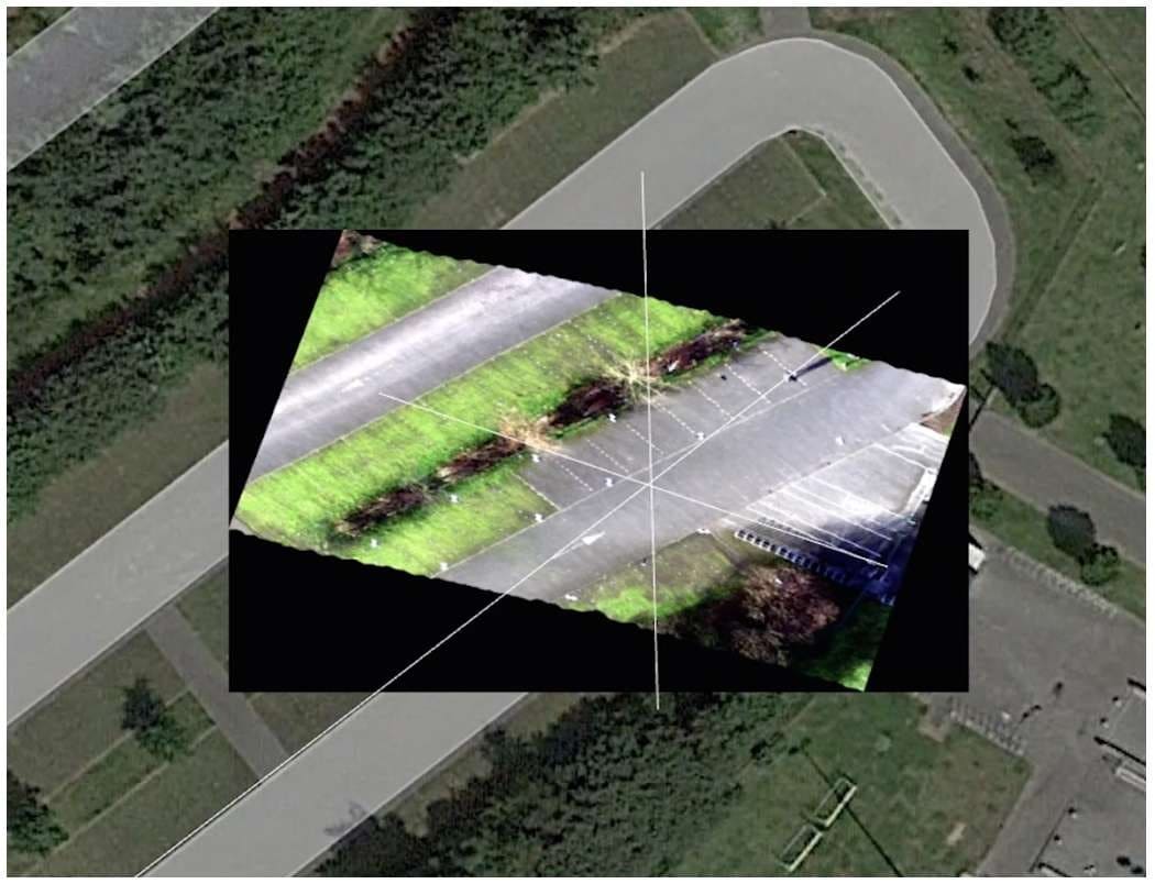 Рисуноке 13 - Пример, где на фоне геопривязанного изображения Google Earth видно, что линия съемки, выполненная с системой AFX и с плохим выравниванием IMU, привела к искажению положения подъездных путей. Белые линии отображают запланированный маршрут полета, которому беспилотник следовал достаточно точно. Однако IMU не был выровнен должным образом, предположительно, из-за недостаточной скорости во время процедуры выравнивания
