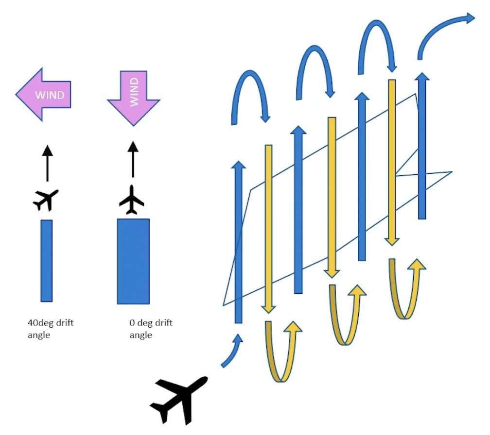 Рисунок 6 - Влияние ветра на боковое перекрытие. Как видно слева, сильный боковой ветер уменьшит ширину вашей полосы захвата и, следовательно, боковое перекрытие. Изображение слева демонстрирует влияние наклонов и кренов на линии полета