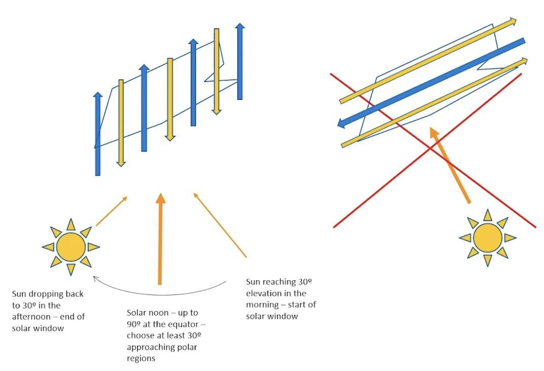 Давайте рассмотрим солнечное окно и ориентацию линии. Солнечное окно означает время суток, когда вы можете собирать данные, которое полностью зависит от угла солнца от горизонта. Хороший минимум с точки зрения атмосферной коррекции составляет 40°. Хотя его можно уменьшить до 30°, это уже резко уменьшит освещенность — проблема, особенно очевидная в северных и крайних южных широтах.