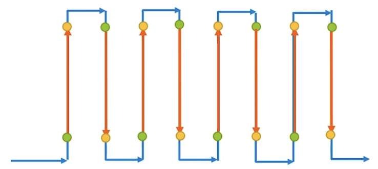 После выравнивания IMU можно переходить к автоматическому полету по запланированному маршруту. БПЛА начнет движение к первой линии полета Specim AFX, где начнется сбор данных, который будет запускаться и останавливаться в предварительно определенных точках. Обратите внимание, что повороты между линиями чередуются: влево, вправо, влево и так далее. Такая последовательность сохраняется на протяжении всего полета, независимо от количества линий. В данном примере, иллюстрирующем бортировку, показаны три линии. После завершения сбора данных можно возвращаться на базу.