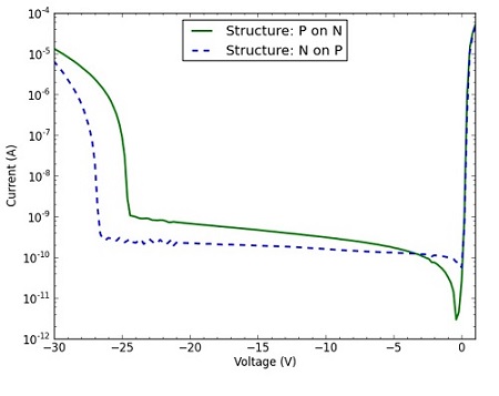 На рисунке 3 показаны вольт-амперные характеристики (ВАХ) детектора на основе Si-ФЭУ типа N на P (серия M) и Si-ФЭУ типа P на N (серия B), снятые при температуре +20 С. ВАХ снимались при помощи SMU 2400, управляемого с помощью программы LabView. Из рисунка видно, что Si-ФЭУ типа P на N имеет напряжение пробоя, равное 24.5 В, в то время как Si-ФЭУ типа N на P имеет напряжение пробоя равное 27 В.