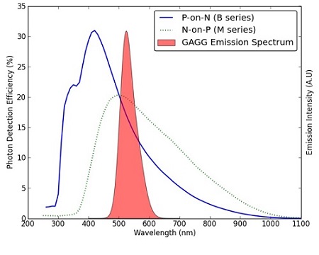 На рисунке 4 приведены спектральные чувствительности Si-ФЭУ типа N на P (серия M) и Si-ФЭУ типа P на N (серия B), а также спектр излучения сцинтиллятора GAGG . Хотя интегральная спектральная чувствительность Si-ФЭУ типа P на N больше чем интегральная спектральная чувствительность Si-ФЭУ типа N на P, спектральная чувствительность последнего лучше совпадает со спектром излучения сцинтиллятора, что позволяет добиться большей эффективности детектирования, а следовательно лучшего энергетического разрешения.