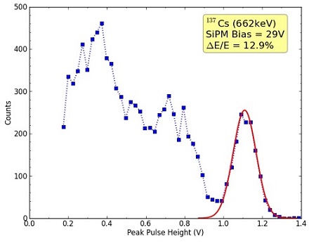 На рисунке 5 показано амплитудное распределение импульсов, измеренное для источника 137Cs (662 кэВ) с помощью детектора на основе Si-ФЭУ типа N на P (серия M), оптически состыкованного со сцинтилляционным кристаллом GAGG. Распределение было записано при +20 С и при напряжении смещения 29 В (при напряжении, на 2 В превышающем соответствующее напряжение пробоя). Энергетическое разрешение ΔE/E, определяемое как полная ширина пика на полувысоте (ПШПВ), отнесенная к среднему значению высоты пика, было вычислено с помощью аппроксимации функцией Гаусса пика 662 кЭв (изотоп 137Cs). Значение энергетического разрешения, полученное из аппроксимационной кривой, показанной на рисунке 5, равно 12.9%. При построении амплитудного распределения импульсов не были учтены эффекты перекрёстных помех, послесвечения и темнового счета. Из-за этих эффектов вычисленное значение эффективности детектирования фотонов, а следовательно и значение энергетического разрешения, могут быть завышены.