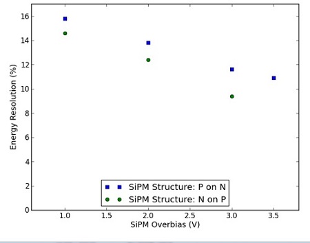 На рисунке 6 показаны зависимости энергетических разрешений Si-ФЭУ типа N на P и детектора на основе Si-ФЭУ типа P на N от избыточного напряжения смещения. Было получено энергетическое разрешение 9.4% для Si-ФЭУ типа N на P (серия M) и энергетическое разрешение 11.6% для Si-ФЭУ типа P на N (серия B) при напряжении смещения, превышающем соответствующие напряжения пробоя на 3 В.