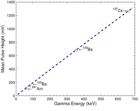 Линейность отклика и динамический диапазон детекторов на основе Si-ФЭУ определяются эффективностью регистрации фотонов (photon detection efficiency (PDE)) и суммарным числом микроячеек. Когда число падающих фотонов намного меньше общего числа микроячеек, линейность отклика детектора на основе Si-ФЭУ - линейная. Для изучения линейности отклика детекторов на основе Si-ФЭУ с размером 3x3 мм2 были измерены амплитудные распределения импульсов для линий 81 кэВ и 356 кэВ (изотоп 133Ba), а также для линии 60 кэВ (изотоп 241Am) с помощью Si-ФЭУ типа N на P, оптически состыкованного со сцинтилляционным кристаллом GAGG. На рисунке 7 показана зависимость средней высоты пика при напряжении, на 2 В превышающем соответствующее напряжение пробоя, от энергии квантов излучения трех указанных радиоактивных изотопов. Экспериментальные точки ложатся на кривую, описываемую уравнением: