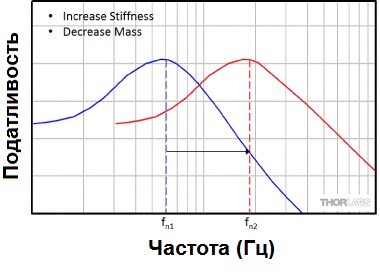 Резонансная частота зависит от жесткости и массы объекта. Уменьшение массы и / или увеличение жесткости сдвигает резонанс к более высокой частоте, как видно на рисунке 4. Увеличение массы и / или уменьшение жесткости сдвигает резонансную частоту ниже.