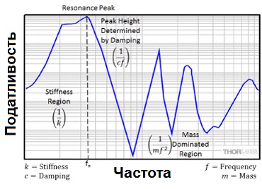 График зависимости податливости от частоты (как видно на рисунке 2) показывает, что податливость жесткого тела можно разделить на три области: жесткость, резонанс и массовые эффекты.