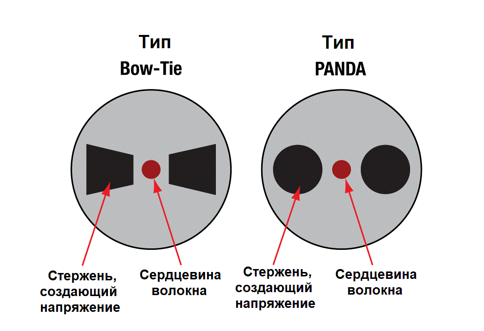 Поляризация падающего света сохраняется во время распространения по PM волокну. Существует много типов волокон с сохранением состояния поляризации, но все они работают одинаково: напряжение в сердцевине создается через стержни в оболочке. Thorlabs предлагает два типа волокон с сохранением состояния поляризации: тип PANDA и тип Bow-Tie. Типы названы по форме силовых стержней, встроенных в волокно (см. рисунок снизу). Волокно с сохранением состояния поляризации используется в оптическом зондировании, интерферометрии и квантовом распределении ключей. Оно также часто встречается в телекоммуникационных приложениях, соединяющих лазерный источник и модулятор. Волокно с сохранением состояния поляризации имеет более высокое затухание, чем одномодовое и многомодовое.