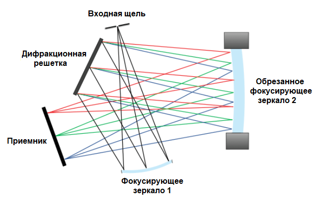 Схема спектрометра Черни-Тернера с двумя усеченными фокусирующими зеркалами
