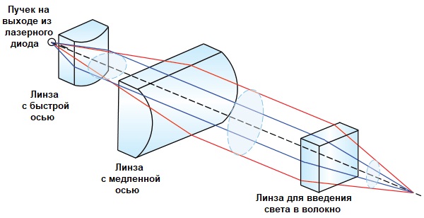 В типичной 14-контактной «бабочке» с волоконно-оптическим выходом может быть до трех отдельных линз, необходимых для обеспечения эффективного и стабильного соединения с оптоволокном. В большинстве высококачественных лазерных диодов используются две поперечные цилиндрические квадратные микролинзы, чтобы компенсировать разницу между углами расхождения быстрой и медленной осей лазерного диода. Первая линза, известная как коллимирующая линза с быстрой осью (FAC), должна иметь значительную числовую апертуру с типичным фокусным расстоянием приблизительно 500 мкм из-за угла расхождения, который обычно составляет около 25 градусов из-за небольшого размера излучающей апертуры. В зависимости от использования одномодового или многомодового диода, медленная ось будет иметь угол расхождения где-то в 3-5 раз ниже, чем ее быстрая ось. Следовательно, для изменения формы луча коллимационная линза с медленной осью (SAC) должна иметь гораздо большее фокусное расстояние, чем линза FAC. В зависимости от размера дополнительного элемента диода, эти элементы могут легко занимать до одной трети доступного пространства платформы, что дополнительно демонстрирует важность использования квадратной микрооптики вместо круглой оптики. После коллимирования луча необходима третья квадратная линза - обычно асферическая - для введения света в оптоволоконный кабель. Так же, как профиль луча и угол расхождения контролируются на этапе коллимации, процесс волоконного соединения активно контролируется для обеспечения максимальной выходной мощности. Для некоторых одномодовых волоконных лазеров также может наблюдаться коэффициент ослабления поляризации. В лазерных диодных системах, где важна цена, и в которых используются лазеры меньшей мощности, вместо пары цилиндрических линз FAC и SAC часто используется одна сферическая или асферическая линза.
