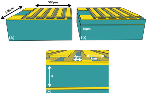 Концепция основана на геометрии из нашей предыдущей работы о «безэховых» ФП переключателях [11,12], где аналогичные переключатели использовались для высокоскоростной растровой гиперспектральной ТГц-визуализации [13]. Эта работа показала, как металлическая пластина, скрытая под ФП структурой, может увеличить спектральное разрешение ТГц системы с разрешением по времени, исключая распространение ТГц импульсов в подложку. Тем не менее, никакие измерения не проводились при абсолютной мощности, излучаемой или применяемой к ТГц-визуализации в реальном времени. Здесь мы максимизировали рабочие параметры с точки зрения электромагнитного моделирования резонатора для конструктивного излучения, приложенного поля и оптического возбуждения для достижения этой характеристики производительности. На рисунке 1 показана схема ФП переключателя и сравнение с классической версией. Верхняя поверхность основана на геометрии электрода со сдвигом [14,15]. Это позволяет оставить небольшое расстояние между электродами при сохранении большой площади ФП поверхности. Для безэхосигнального устройства тонкая металлическая пластина вставляется между активным слоем GaAs и верхней поверхностью на расстоянии d, чтобы реализовать резонатор и отражать генерируемую ТГц мощность без ТГц поля, передаваемого через подложку. Поскольку переходный ток, генерируемый импульсом оптического возбуждения, имеет направление, фиксированное встречными металлическими слоями, параллельными плоскости слоя золота, структура аналогична оптическому резонатору Фабри – Перо. Как сообщалось ранее, нижняя продольная мода удовлетворяет условию резонанса d=λ/2, где λ- длина волны в активном слое и соответствует частоте среза. Эту толщину, однако, также можно рассматривать как резонатор с квази-четвертью длины волны для длин волн ниже частоты среза. Как обсуждалось впоследствии, этот резонатор также сохраняет широкополосный отклик. Мы ясно показываем, что это допускает конструктивные помехи в дальнем поле и увеличивает среднюю абсолютную выходную мощность до уровня в сотни микроватт со стандартным генератором в качестве источника возбуждающего лазера.