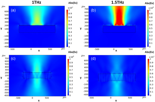 Рис. 2. Электромагнитное моделирование поляризованного испускаемого электрического поля x при 1 и 1.5 ТГц (максимальная эмиссия поля стандартного и квазирезонаторного ФП переключателя, соответственно) для (a), (b) квазиполости и (c), (d) стандартный ФП переключатель.