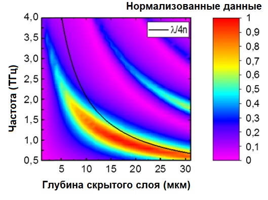 Влияние излучаемой частоты можно увидеть на рис.3, где показан контурный график поля, излучаемого устройством в зависимости от частоты (ось y) и расстояние между толщиной GaAs [от вершины слоя GaAs до встроенного металла (d)]. Как можно видеть, наблюдается четкое резонансное поведение, при котором излучение пиковой частоты смещается к более высоким частотам, при уменьшении d, что подчеркивает эффект резонатора. В случаях, когда d>10 мкм полосы частот более высоких порядков наблюдаются благодаря тому, что толстый GaAs в дальнейшем выступает в качестве резонатора Фабри – Перо. Поскольку частота излучения этих структур обычно достигает 4 ТГц, расстояние d = 10 мкм выбирается в качестве оптимального для ФП переключателя, чтобы избежать каких-либо генерируемых колебаний Фабри-Перо, где первая углубление может ожидаться при λ ~ 2 nd ~ 72 мкм ~ 4.2 ТГц (где n показатель преломления GaAs). Это дает усиление на центральной частоте 1.5 ТГц, что хорошо соответствует центральному излучению этих ФП переключателя. Черная линия соответствует условию четверти длины волны (v= c / 4 nd). Отклонение смоделированных данных от этой линии является результатом показателя преломления металла, что приводит к увеличению эффективного показателя при уменьшении слоя GaAs [16].