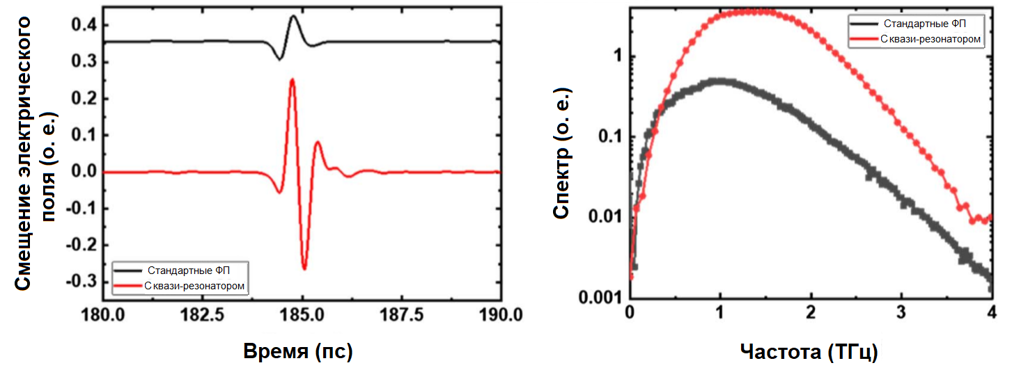 Рис. 5. (а) Временная характеристика электрических полей и (б) спектр стандартных и квазиполостных ФП-переключателей.
