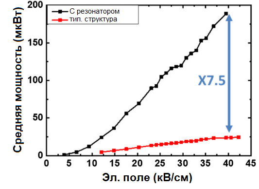 Когерентные измерения ТГц поля сопровождались тщательными исследованиями средней мощности с использованием калиброванного пироэлектрического детектора (LP20 от SLT Sensor и Lasertechnik, откалиброванного PTB Braunschweig and Berlin при 1,4 ТГц с чувствительностью 66 В/Вт). Излучение собирается и фокусируется на детекторе с использованием двух параболических зеркал F # 2. Поскольку переключатель должен работать в геометрии отражения, собранной с передней стороны переключателя, оптическая накачка была полностью отфильтрована с использованием тефлоновых и черных пластиковых фильтров, а инфракрасная камера использовалась для проверки того, что оптический луч не падает на детектор. Результаты не корректируются для поглощения фильтров. Чтобы измерить мощность, на устройство добавляется модуляция 20 Гц поверх модуляции 40 кГц. Для максимального приложенного поля мощность считывается непосредственно на осциллографе [8] через пиковое напряжение. ТГц отклик проверяется путем размещения металлической пластины перед детектором, чтобы избежать ложных показаний электромагнитных помех. Эта абсолютная мощность используется для калибровки пироэлектрических детекторов, который более чувствителен для измерения мощности при более низких электрических полях. На рисунке 6 показана измеренная средняя мощность как функция приложенного поля для квазиполости и стандартного переключателя. Здесь, для стандартного ФП-переключателя, шаг имел ширину 2 мкм, разделенный зазорами 2 мкм. (Электромагнитное моделирование показывает, что расстояние между 4 и 2 мкм не имеет различий в излучаемом электрическом поле; см. Рис.7.) Наибольшая мощность, измеренная для квазиполостного переключателя, составила 181 мкВт по сравнению с 24 мкВт для стандартного переключателя при 39,5 и 42,25 кВ / см, соответственно. Первый соответствует эффективности оптического излучения в ТГц 0,05%. Следует отметить, что соотношение между этими двумя устройствами не является постоянным, причем контрастность при приложенных полях выше 35 кВ / см. Возможно, это является результатом усиленного рассеивания тепла в устройстве на основе резонатора, где толстый скрытый слой золота может легко отводить генерируемое тепло из пятна возбуждения.