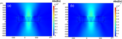 Рис. 7. 2D-график распределения электромагнитного поля для стандартной структуры с (a) 2 мкм и (b) 4 мкм межцифровым интервалом.