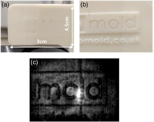 Чтобы проиллюстрировать применение этих средних высоко-ТГц мощностей, ТГц-визуализация в реальном времени была выполнена с использованием недавно выпущенной в продажу ТГц камеры TZcam (i2S) на основе микроболометрического массива [5]. Предыдущая работа с этим типом камеры показала изображение в реальном времени только с ТГц QCL [5] и изображение только точки фокусировки стандартного ТГц фотопроводящего переключателя [18] (FWHM=320 мкм). Оптически непрозрачный пластиковый объект показан на рис. 8 (a) и 8 (b), и размещается на пути ТГц-луча сразу после фокусирующего параболического зеркала. Круглая область с подсветкой имеет диаметр 2 см. На рисунке 8(с) показано ТГц изображение, полученное камерой в режиме реального времени, и отчетливо виден скрытый текст с пространственным разрешением приблизительно 400 мкм. Важно отметить, что в отличие от ТГц визуализации с монохроматическими источниками, такими как ККЛ [19], сильные дифракционные эффекты не наблюдаются из-за спектрально широкополосной природы ТГц переключателя, где дифракция каждой частоты оказывает разрушающее воздействие. Это подчеркивает преимущество использования спектрально широких источников для ТГц визуализации. Видео в реальном времени c объектом, движущимся в плоскости ТГц луча, можно найти ниже. Яркое пятно в центре изображения является результатом отверстия в первом параболическом зеркале, которое используется для возбуждения переключателя в режиме отражения (подробности настройки измерения см. на рис.9). Хотя визуализация с более высоким разрешением и качеством изображения может быть получена с помощью ТГц QCL (из-за более короткой длины волны и более высоких мощностей), они работают при криогенных температурах. Дальнейшие QCLs работают на более высоких частотах (> 2 ТГц ) где материальные потери больше, уменьшая проникновение и, следовательно, повышая, потенциал применения в неразрушающем контроле. Здесь дальнейшая оптимизация позволит фотопроводящим переключателям достигать уровней мощности в милливаттах (см. ниже), что улучшит качество изображения, хотя разрешение будет ограничено собственным излучением с центром около 1.5 ТГц.