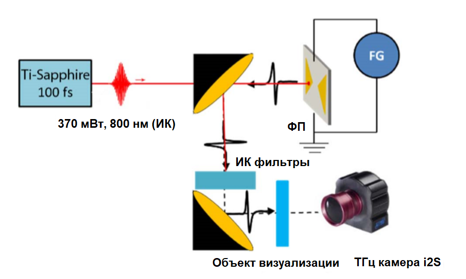 Рис. 9. Схема настройки визуализации в реальном времени. ФП переключатель возбуждается инфракрасным лучом 800 нм, проходящим через отверстие в первом параболическом зеркале. Изображаемый объект помещается сразу после второго параболического зеркала. ИК-фильтры гарантируют, что на камеру не попадает ИК-излучение.