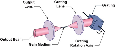 В компании Daylight Solutions были сформированы основные технологии вокруг квантово-каскадных лазерных чипов, покрытий, дизайн резонатора, управления теплоотводом и конструкции повышенной прочности. Конфигурация с внешним резонатором ECqcL используемая компанией Daylight Solutions показана на рисунке 1. Чип усиления квантового каскадного лазера устанавливается между двумя коллимирующими линзами. Запатентованный дизайн и размещение этих линз облегчает сбор света, сильно расходящегося от чипа лазера. Коллимированное излучение от двух линз соединяется и попадает на селективно отражаемую дифракционную решетку. При повороте дифракционной решетки излучение различной длины волны подается обратно в квантово-каскадный чип, заставляя его излучать с характерной узкой спектральной шириной линии. При разумном размещении оси, вокруг которой вращается дифракционная решетка, длина резонатора может быть точно согласована с выбранной длиной волны излучения, и перестройка длины волны может быть получена при непрерывной фазе сигнала (режим свободный от перескока моды). Благодаря такой конструкции стало возможным получить перестройку длины волны излучения > 120 см-1 в режиме без перескока моды и более 500 см-1 общей перестройки.