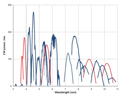 Как упоминалось выше, были изготовлены квантово-каскадные чипы, которые создают излучение в спектральном диапазоне от 2,75 до 160 мкм. Компания Daylight Solutions использует такие лазерные чипы с внешним резонатором (ECqcL) для производства инфракрасных перестраиваемых лазеров. На рисунке 2 показана типовая производительность таких лазерных систем.