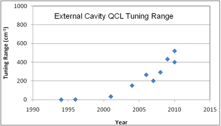 Многие применения в средней ИК области спектра требуют широкого спектрального диапазона длины волны излучения. Научные исследователи предложили несколько способов расширить спектральный диапазон работы квантовых каскадных лазеров. Прямой метод заключается в расширении усиления отдельных чипов. На рисунке 3 представлен график диапазона перестройки центральной длины волны излучения квантовых каскадных лазеров, встречающихся в научной литературе. Как видно, есть тенденция к более широкой перестройке длины волны излучения и перестройка от 800 до 1000 см-1, вероятно, не за горами. Другие исследователи работали над производством нескольких чипов усиления на одном кристалле.