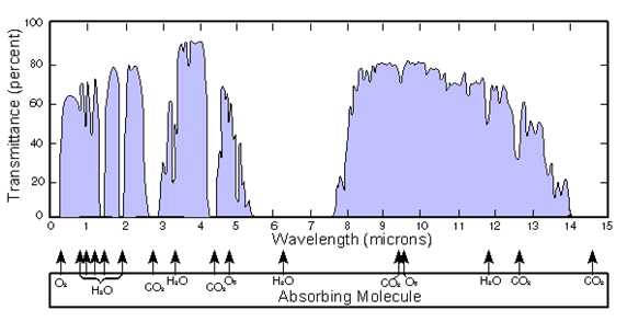 Рисунок 4. Пропускание света через атмосферу от видимой до средней инфракрасной области. Показаны источники основных поглощений.