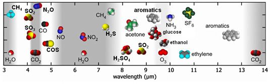 Рисунок 5. Графическое представление расположения сильных поглощений различных молекул газов.
