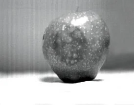 SWIR-изображение красного яблока. На яблоке явно видны пятна. Легко осмотреть любые дефекты. |