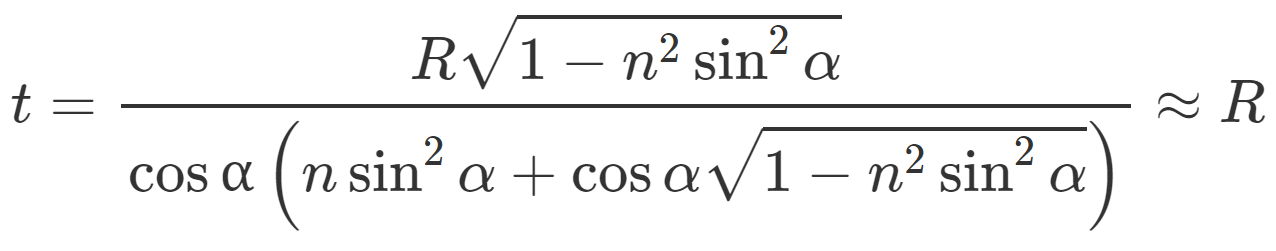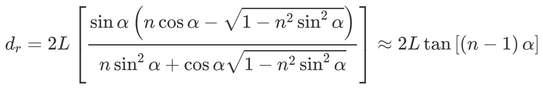 Упрощенное уравнение предполагает, что угол преломления мал и становится менее точным при уменьшении α.