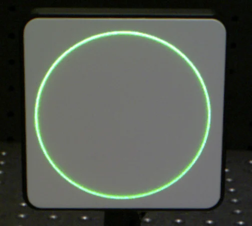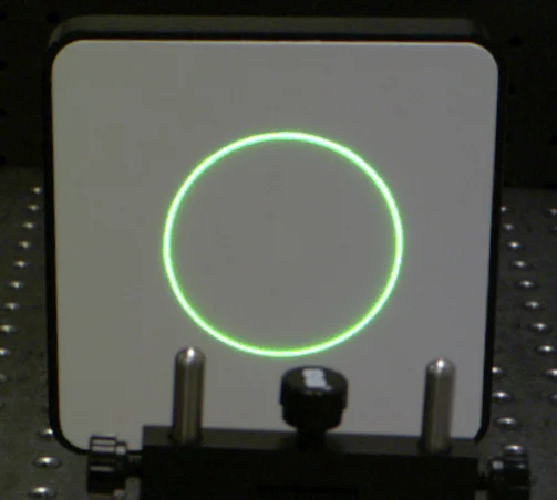 Рисунки представляют собой реальные изображения фокусировки лазера зеленого цвета аксиконом. Цифры иллюстрируют способность аксикона поддерживать постоянную толщину кольца и пропорциональные диаметр с расстоянием. На рисунке аксикон расположен на L = 228,6 мм, а на втором рисунке – на L = 355,6 мм. Изображения были созданы с использованием лазера с диаметром пучка 4 мм, белых мишеней 127 x 127 мм и аксикона с углом альфа 20°. Для обоих рисунков толщина кольца осталась 2 мм, а диаметр увеличился с примерно 73,66 мм при L = 228,6 мм между аксиконом и изображением до примерно 114,3 мм при L = 355,6 мм.