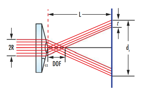 В отличие от гауссова пучка, который ухудшается с увеличением расстояния, пучок Бесселя не дифрагирует, сохраняя неизменное поперечное распределение при распространении. Хотя настоящий бесселев пучок требует бесконечного количества энергии для создания, аксикон создает максимально близкий к нему пучок с почти недифрагирующими свойствами в пределах глубины резкости (DOF). Глубина резкости является функцией радиуса луча, входящего в аксикон (R), показателя преломления аксикона (n) и угла альфа (α):