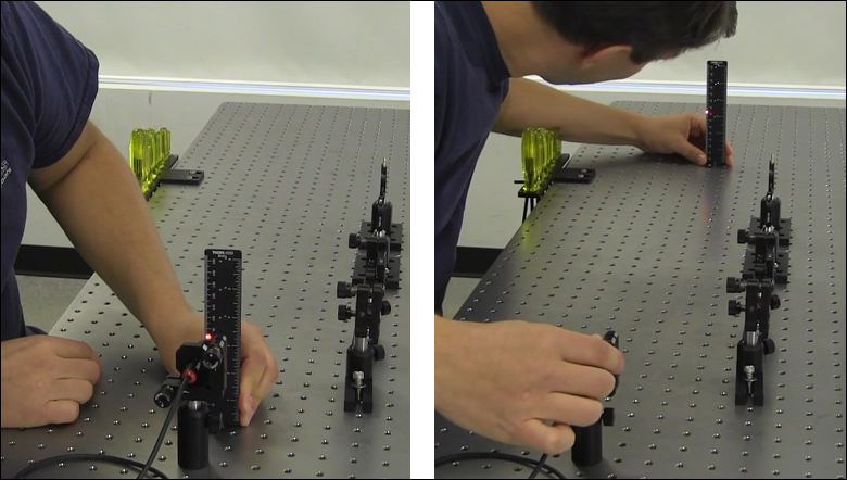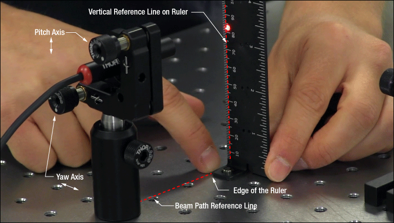 На видео видно, когда линейка была выровнена по резьбовым отверстиям и расположена близко к лазеру, край луча и концы линейки толщиной 1 мм совпадали. Когда линейка была перемещена в дальнюю точку на опорной линии, положение луча на линейке было смещено по горизонтали. С линейкой в этом удаленном положении регулировка поперечного наклона крепления была настроена до тех пор, пока край луча снова не совпадал с линейками 1 мм. Затем линейку перемещали ближе к лазеру, чтобы наблюдать влияние регулировки крепления на положение луча. Это повторялось по мере необходимости.