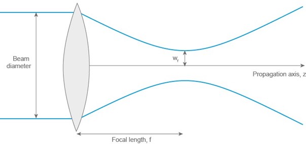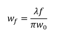 Когда гауссов пучок фокусируется линзой с фокусным расстоянием f, перетяжка (или уравнение размера лазерного пятна) становится: