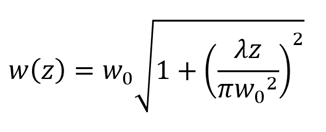 Когда лазерный пучок распространяется по оптическому пути, его диаметр постоянно меняется. Если мы рассмотрим идеальный случай гауссова луча, ширина пучка (или радиус w) вдоль оси распространения z определяется следующим уравнением: