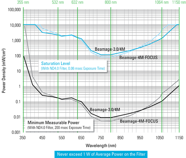 Также нужно принять во внимание, что чувствительность профилировщика лазерного пучка изменяется с длиной волны. Чтобы упростить расчеты, компания Gentec-EO представляет кривые минимальной и максимальной плотности мощности для каждого из профилометров пучка.